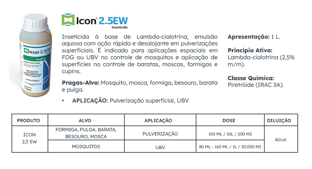 Diluir 100 ml de ICON 2,5EW em 10 litros de água e aplicar uniformemente (200 m2) onde as pragas ocorrem e se escondem,