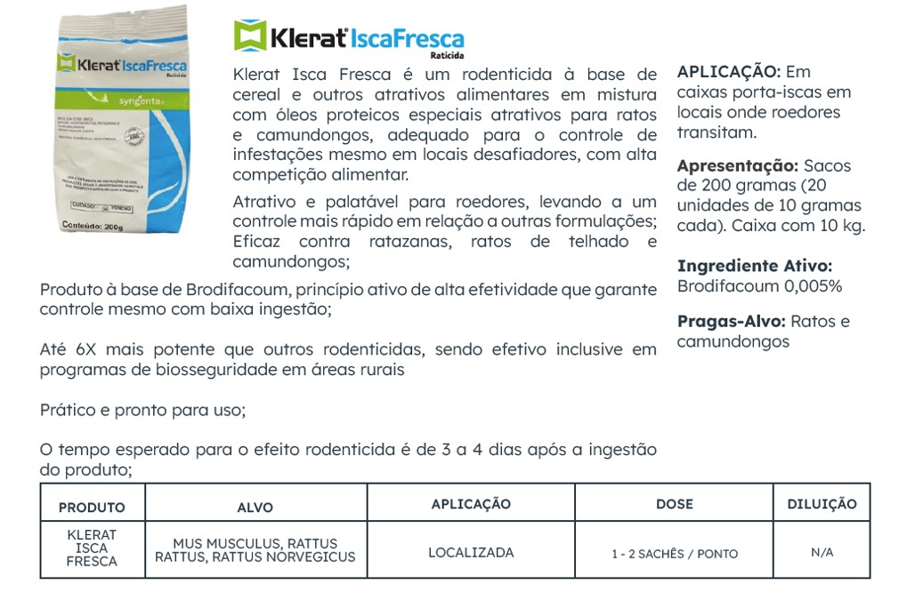 É um raticida ISCA FRESCA / SOFT a base de cereal e outros atrativos alimentares em misturas com óleos proteicos especiais atrativos para ratos e camundongos.